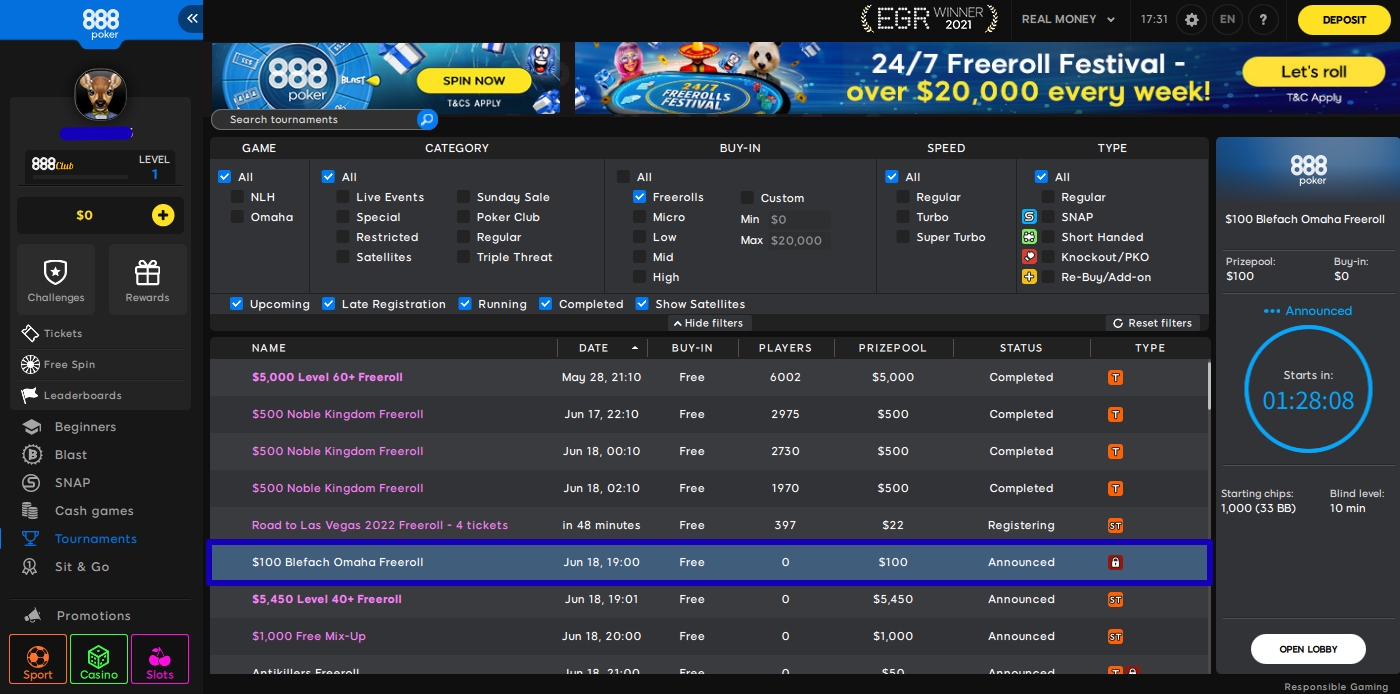 🤑 $100 Blefach Omaha Freeroll для подписчиков Блефача на 888poker!