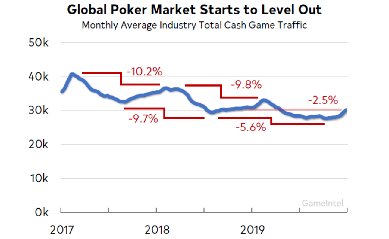 Последние годы трафик в онлайн покер ежегодно снижался на 10%. И в 2019 году, кажется, ситуация наконец-то стабилизировалась.