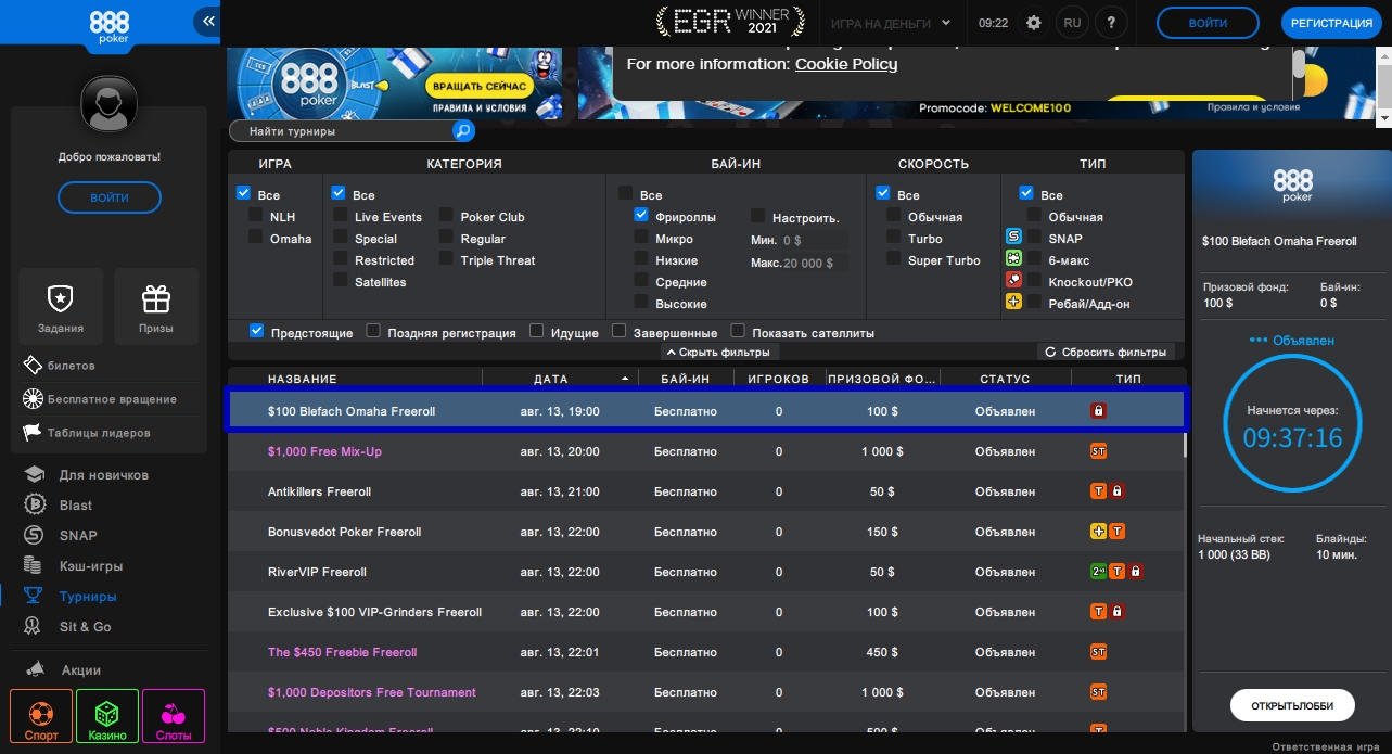 🔥 Сегодня, 9 августа в 18:00 МСК на 888poker стартует бесплатный турнир с призовым фондом $100. Вкратце пройдёмся по ключевой инфе: