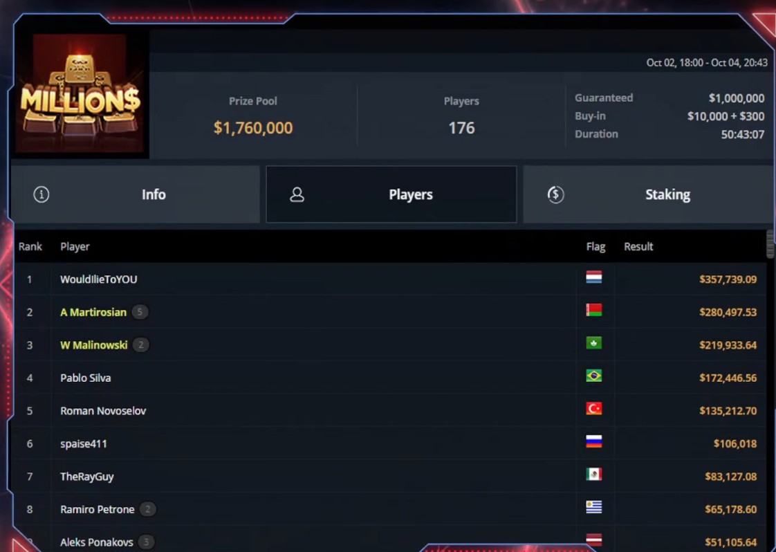 💰 176 игроков сформировали призовой фонд $1.760.000, а победителю достанется знатный его кусок — $357.739.09. Продолжат борьбу за большие деньги будет сразу 5 (!) наших игроков: в роли чипака Роман Новоселов, выступающий под флагом Турции, а также Виктор Малиновский, spaise411, Алексей Поняков и Артур Мартиросян