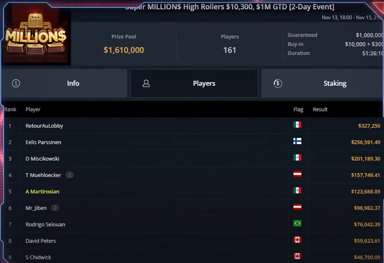 😱 Чудеса случаются в покере и в мире хайроллеров, где конкуренция невероятно высокая. Возможно, мы чего-то не знаем о мексиканском игроке с ником RetourAuLobby, но его победа во вчерашнем Super MILLION$ с бай-ином $10.300 в первом приближении видится именно чудесным свершением:
