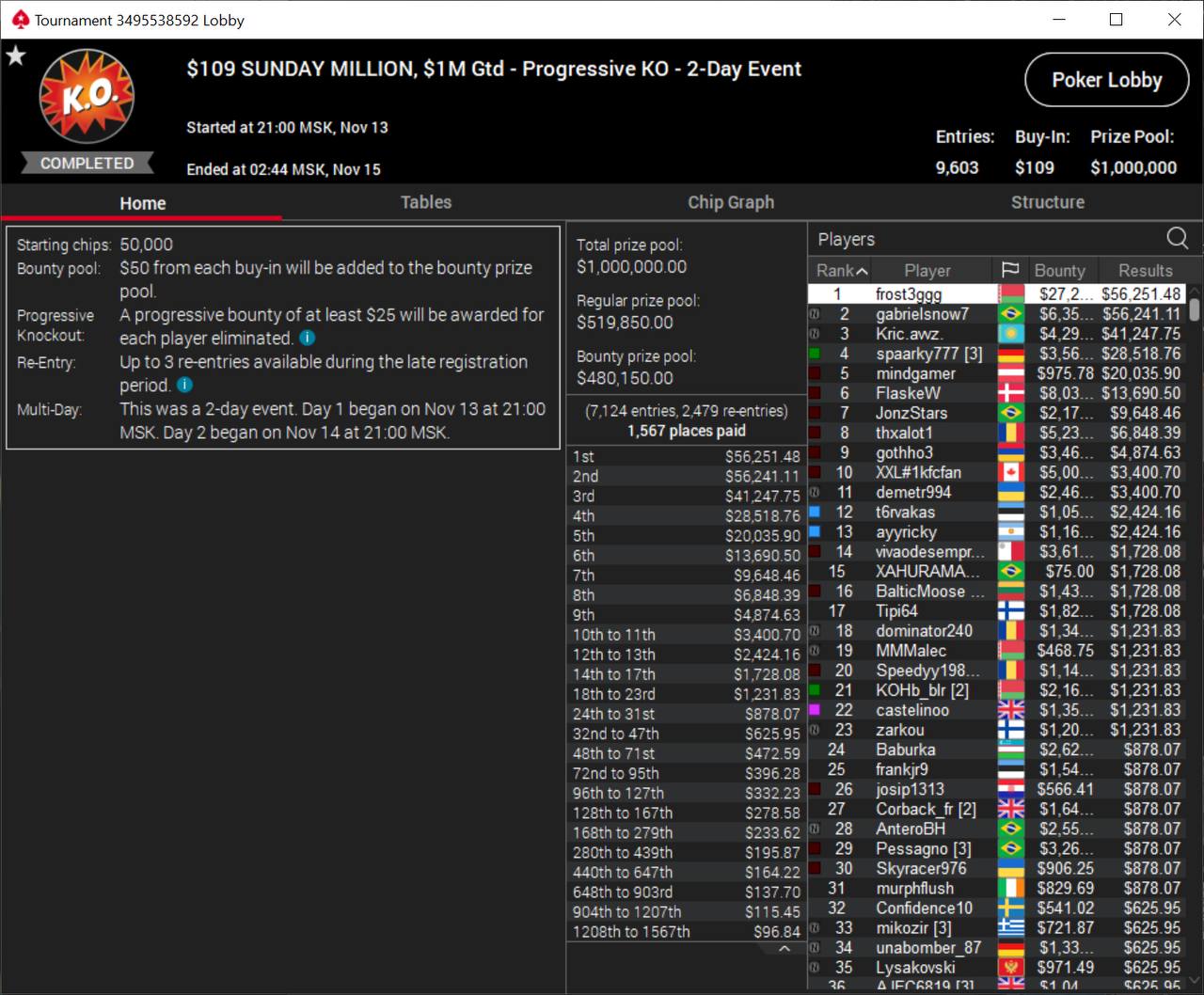 💬 В своём блиц-интервью после победы frost3ggg отметил, что до этого лучшим результатом именно в Sunday Million были относительно небольшие призы — в районе $2-3К. Но победа оказалась нелёгкой: на стадии топ-30 у нашего героя оставалось всего 3 ББ, так что пришлось провести колоссальную работу по наращиванию стека