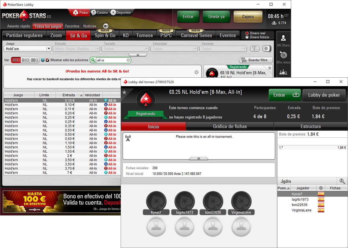 PokerStars тестирует новую игру на испанском рынке: All-in Sit-and-Go. Да-да, это то, что вы могли подумать — СНГшка, где все в первой раздаче идут олл-ин, и победитель забирает всё. Форматы: 2-max / 4-max / 8-max, лимиты от €0,25 до €250