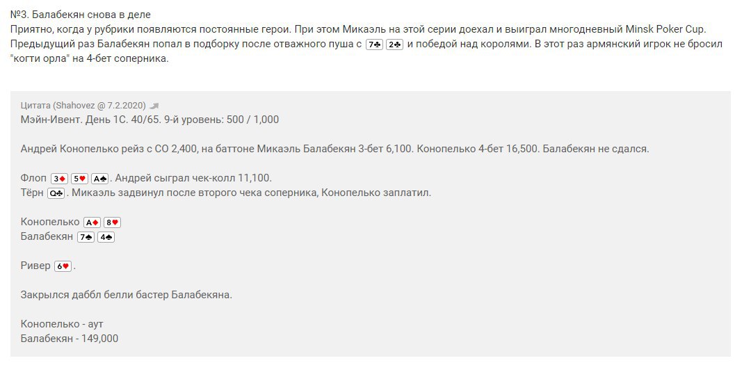Журналист Дима Шахов поделился своим топ-5 раздач с прошедшей в Минске серии EAPT: 7-бет пуш с 7-6, "Когти Орла" и прочая дичь. Было интересно почитать :D