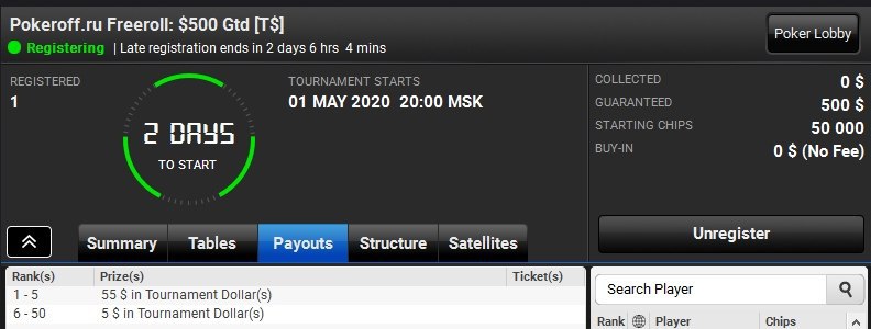1 мая (в эту пятницу) в 20:00 МСК Покерофф проводит закрытый фриролл с призовым фондом $500 на partypoker. Пароль на него будет опубликован туточки в 17:00 МСК.