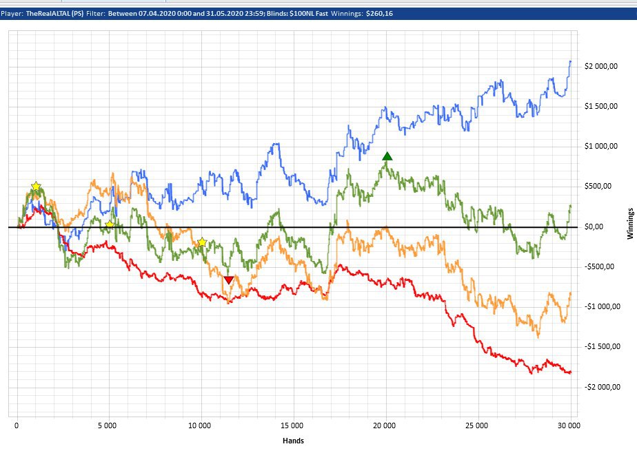 Месяц назад «истинный король» (как он себя называет, хех) забился на $1000, что откатает 30,000 раздач с винрейтом не хуже -2bb/100 и не справился. Поздравляем Сергея «Buruchaga» с лёгкими бабками!