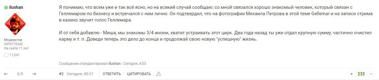 Что сказал Геллемар? "Я не гемблер вы все врети!" Ему предложили несколько способов подтвердить свою личность: сделать селфи, выйти в видеозвонок, или выйти в аудиозвонок (Илюшан-Петров-Геллемар), но на всё он отказался. Говорит, не может палить щщи из-за того, что на него может открыть охоту полиция и прочую лабуду про бизнес интересы.