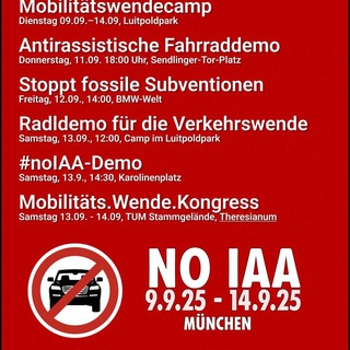 Ihr wollt die Ausbeutung durch Autokonzerne, ihre Verwüstung unseres Planeten, ihre Profitmaximierung auf unser aller Kosten auch nicht hinnehmen? Dann kommt am 13.09. um 14:30 Uhr zum Karolinenplatz in unseren antikapitalistischen Block und folgt t.me/blockIAA für Infos rund um die Proteste gegen die IAA.