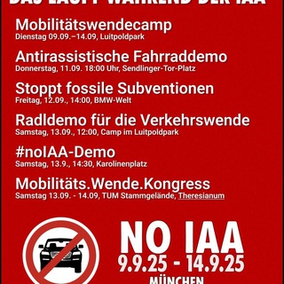Ihr wollt die Ausbeutung durch Autokonzerne, ihre Verwüstung unseres Planeten, ihre Profitmaximierung auf unser aller Kosten auch nicht hinnehmen? Dann kommt am 13.09. um 14:30 Uhr zum Karolinenplatz in unseren antikapitalistischen Block und folgt t.me/blockIAA für Infos rund um die Proteste gegen die IAA.