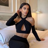 Он мягкий, легкий, плотный, прочный и ощущаются словно "вторая кожа". Укороченный лонгслив и укороченные шорты с легким корректирующим эффектом выполнены из мягкой ткани - корейского трикотажа
