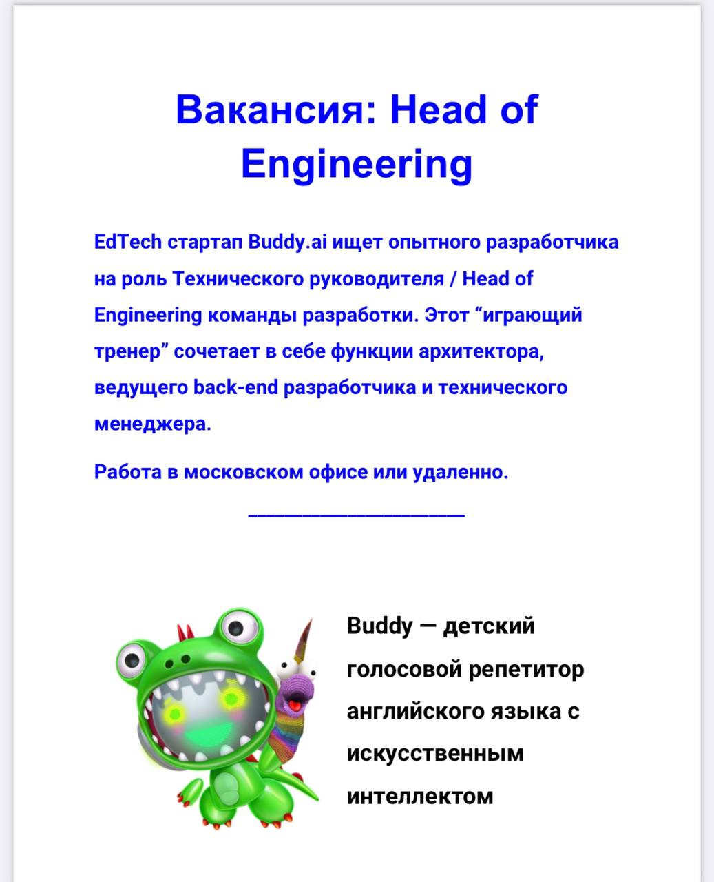 EdTech стартап Buddy.ai родом из Кремниевой долины ищет опытного разработчика на роль Технического руководителя / Head of Engineering команды разработки.