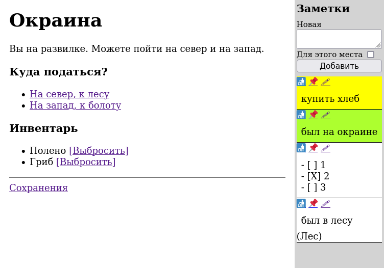 Подбор предметов намекает на выбрасывание оных, а это уже отслеживание того, где и что было выброшено. Но сделали! И, разумеется, учли в подсистеме сохранений. А ещё добавили ведение заметок, сквозное для всех сохранений (не изменяется при загрузке старых). Заметки можно прикреплять к локациям или просто "пришпиливать" чтобы всегда были на виду — всё это влияет на то, что и когда отображается.