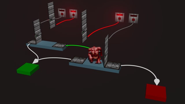 При этом не используются никакие трюки вроде эксплойта, который позволяет запускать произвольный код и даёт возможность запустить Doom в Doom (ссылка на этот эксперимент есть в статье). Логические элементы, из которых собран калькулятор, реализованы в виде сети из маленьких комнат, которые соединены в бинарные диаграммы решений, а внутри имеют управляемые извне дверями и телепортами. Роль носителей информации выполняют монстры, которые проходят через двери и телепортируются.