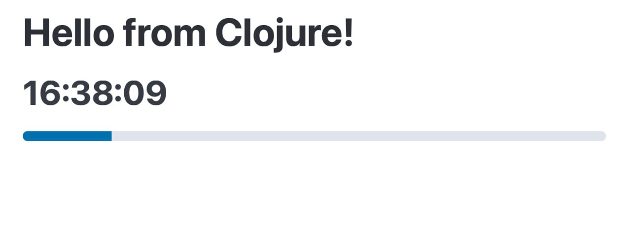 <script>! Это же настоящий No Build, про который любит говорить DHH 😆Мне самому подход No Build очень импонирует, вот и в демо я просто в строковом литерале отгрузил кусочек ClJS — хотелось уложиться именно в один файл. Тем более что в Emacs можно выделить регион и открыть в отдельном буфере как код на заданном языке (да, не только в IDEA так можно, хоть в последней и прямо по месту код подсвечивается). Скрипт мой оживил часики на страничке и progress bar в такт секундам начал двигать (виджет взял из Pico.CSS, потому что не умею верстать). А заодно получилось показать, как обращение с объектами хостовой платформы делается.