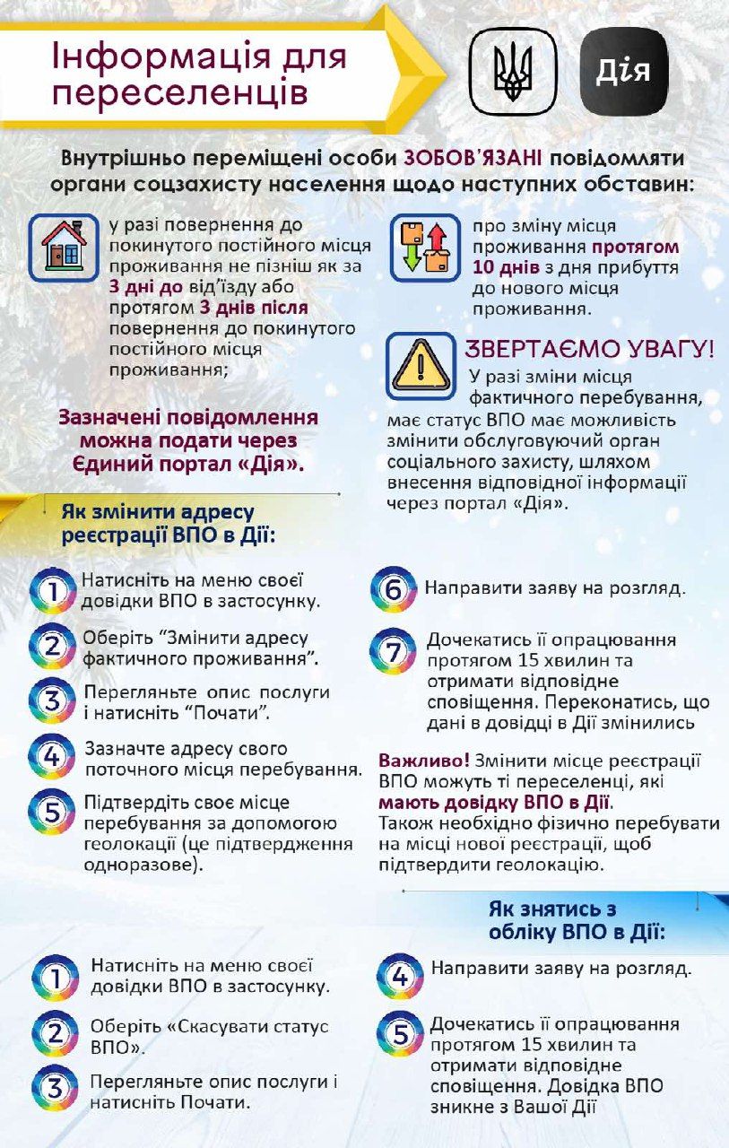 Зазначені повідомлення можна подати через Єдиний портал «Дія», який також дозволяє за потреби знати особу внутрішньо переміщених осіб – стасувати статус ВПО.