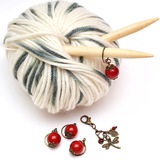Набор маркеров для вязания спицами и крючком с бусинами красной яшмы и подвесками в виде вензелей медного цвета.