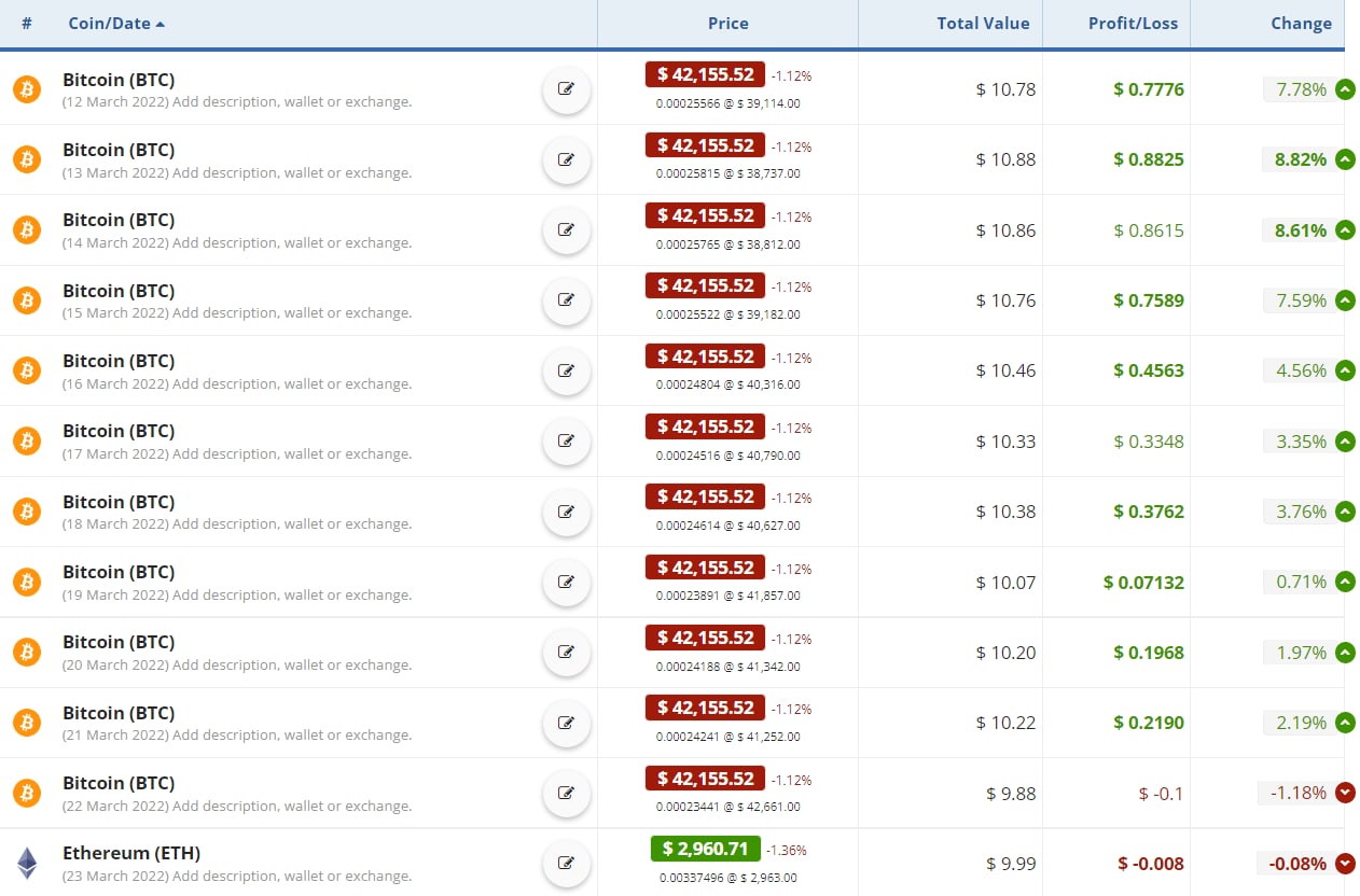 Но эксперимент не прекращался. Все покупки в рамках «10$ Баффетта» мы продолжаем отмечать в cryptocompare.