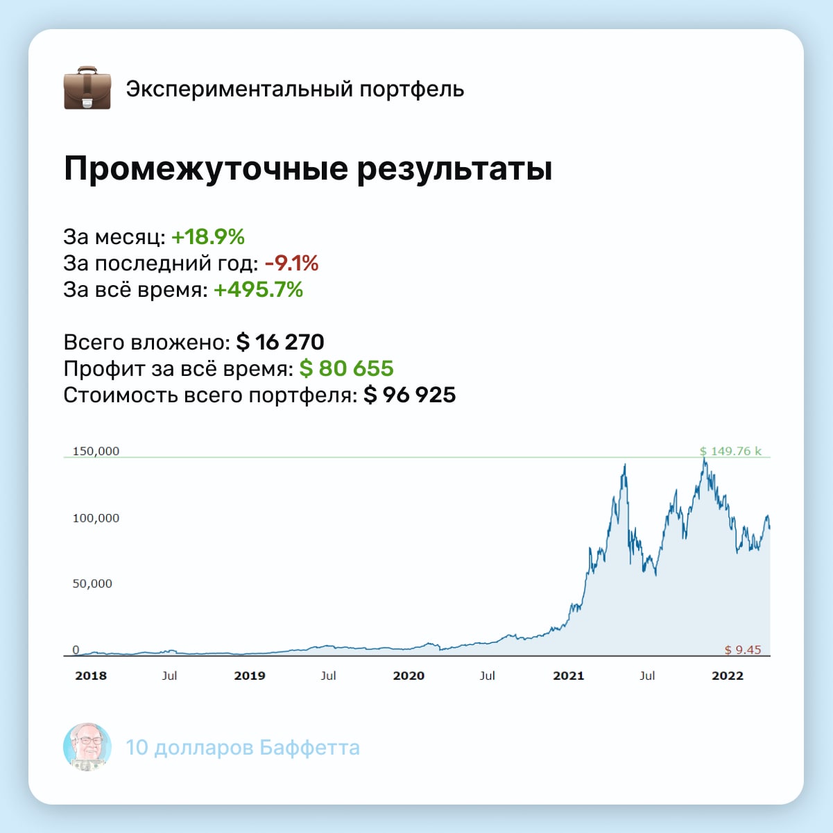 💼 Сегодня на $10 докупаем BTC. Результаты портфеля «10$ Баффетта» вы всегда можете посмотреть по ссылке.