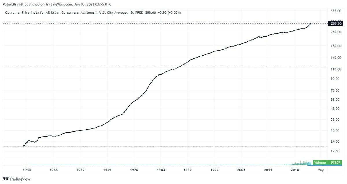 «Этот график показывает разрушение покупательной способности доллара США за годы, прошедшие с момента моего рождения. C 1947 года 1 доллар подешевел до $0,074»