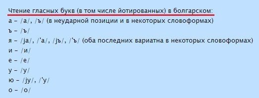В болгарском языке 6 гласных звуков: /а/, /ъ/, /и/, /е/, /у/, /о/. Насчет них следует сделать следующие замечания для русскоговорящих: