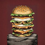 The burger-like character from Matt Furie’s Cortex Vortex is officially named Burglar, not “Burger Face,” as confirmed by Furie’s Invasive Species exhibition at Left Field Gallery in 2023