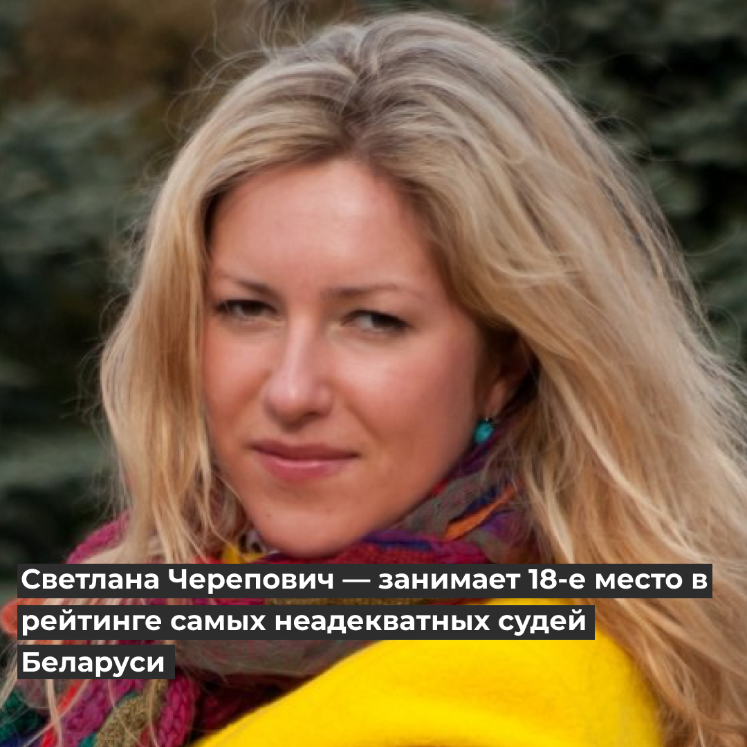 Судья Светлана Черепович — страна должна знать своих «героев». Судья Первомайского района г. Минска, Светлана Черепович занимает 18-е место в рейтинге самых неадекватных судей Беларуси (рейтинг https://t.me/s/nic_and_mike), по политически-мотивированным административным делам выписала штрафов на общую сумму 29,9 тыс рублей, суток — 962.