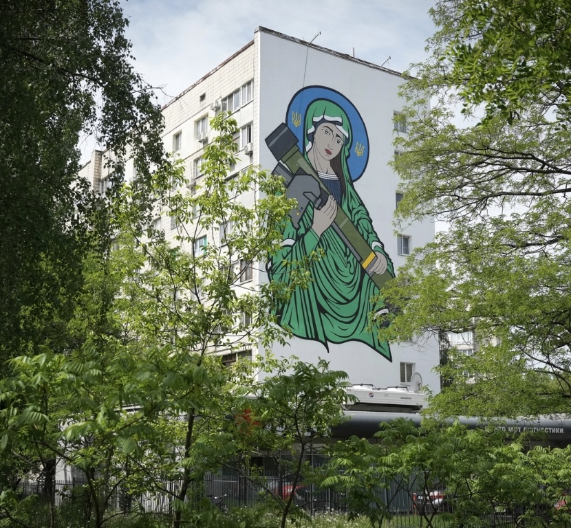 В украинской столице художники создали огромный мурал «Святая Джавелина» в честь переносного противотанкового ракетного комплекса Javelin, который феерично уничтожает российскую технику.