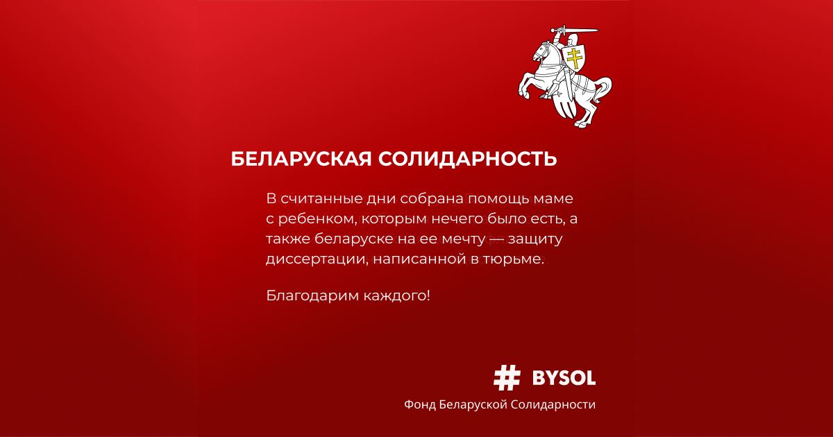 В считанные дни собрана помощь маме с ребенком, которым нечего было есть, а также беларуске на ее мечту — защиту диссертации, написанной в тюрьме. Благодарим каждого!
