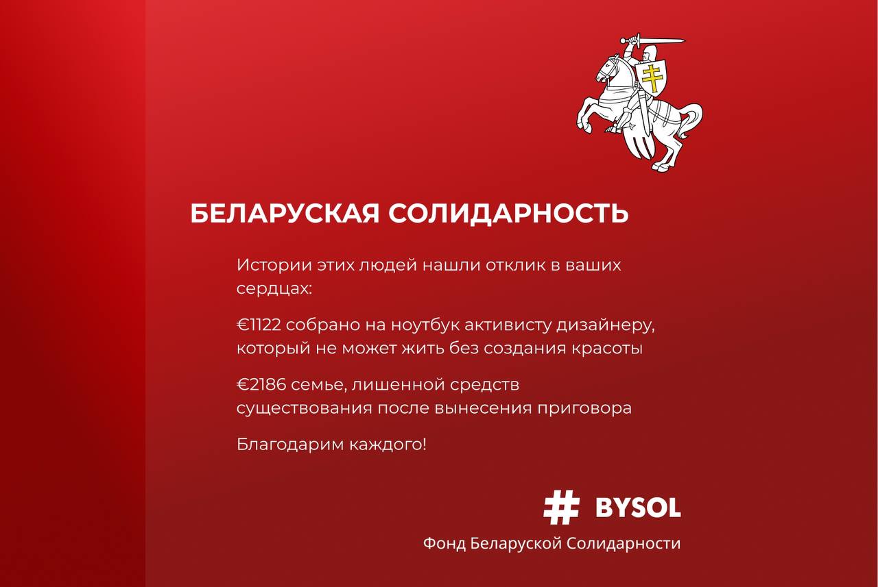 Собрана помощь для активиста-дизайнера Анисимова Дмитрия https://bysol.org/ru/private/anisimov/ и для семьи активиста Михаила Тихоновича https://bysol.org/ru/private/tikhonovich/ .