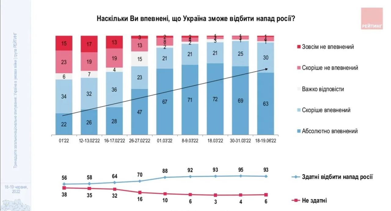 Число украинцев, уверенных в победе, постоянно растёт. Согласно результатам опросов "Рейтинга" проведённых непосредственно перед нападением России, были уверены в победе немногим более половины опрошенных. В опросах, проведённых уже после начала войны, этот показатель в за 4 месяца вырос с 70% до 93%.
