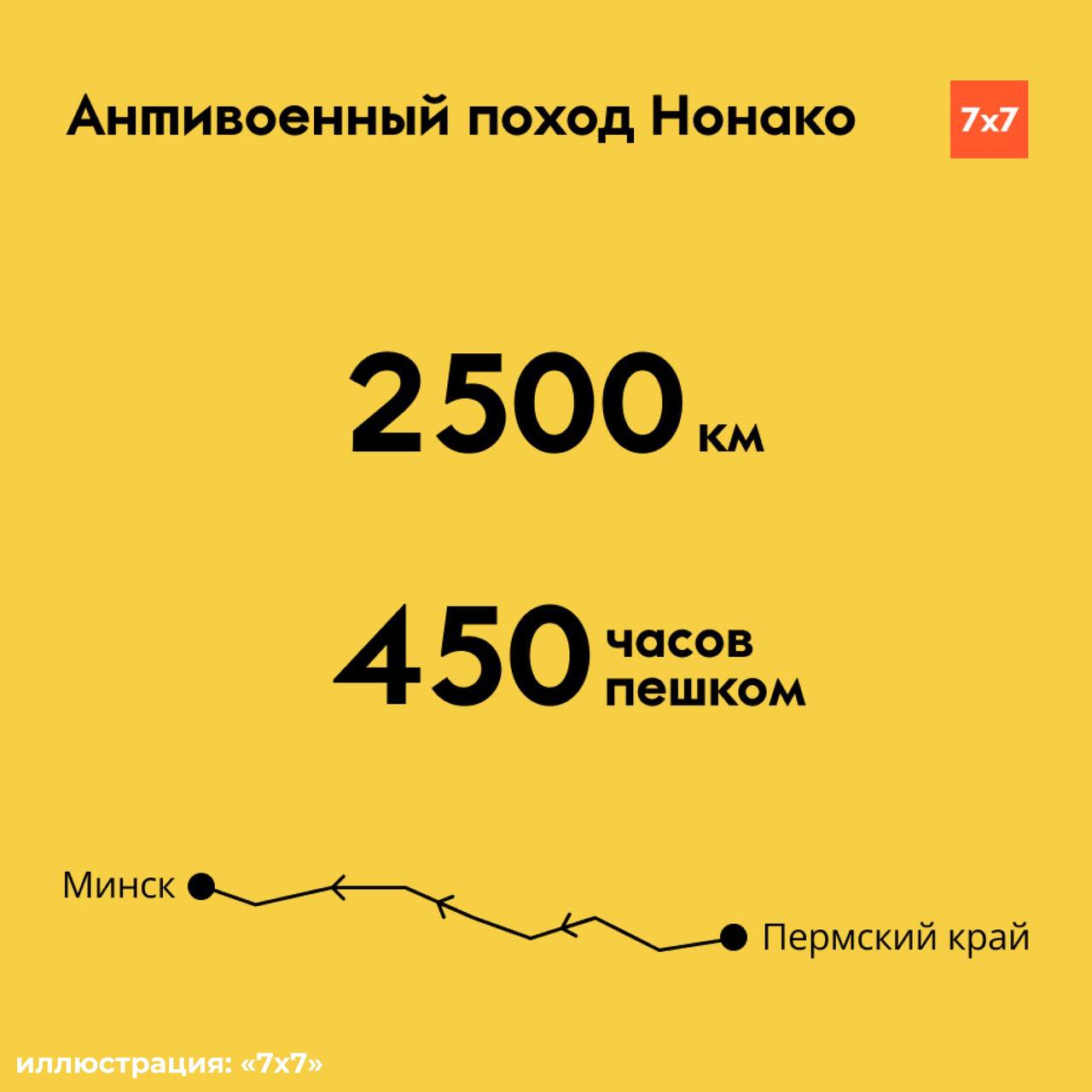 29-летняя девушка отправилась в антивоенный поход. Из соображений безопасности она просит называть себя другим именем — Нонако. Она планирует пройти 2500 км, чтобы по пути говорить с россиянами и беларусами о войне в Украине и собрать деньги на помощь политзаключенным в России и Беларуси. О своей акции Нонако рассказала «7х7».