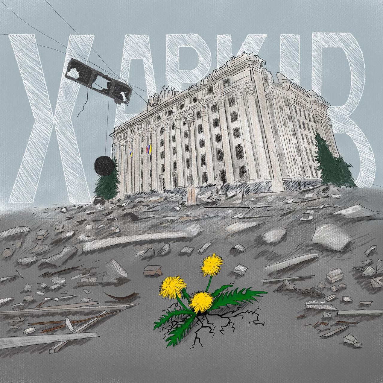 — Я была не ва ўсіх гарадах, што малявала. Не была ў Краматорску і Херсону. І калі гугліла карцінкі то разумела, што гэта ўсё не тое. І самы просты варыянт быў напісаць маім знаёмым: пра іх любімыя месцы, пра месцы, якія яны лічаць адлюстраваннем свайго гораду. Іх я брала за аснову і далей ўжо дадавала нешта сваё. Першы арт пра Харкаў, я ўбачыла вiдэа, калi віланчэліст граў на фоне разбураных гістарычных будынкаў, тым самым прыцягваў увагу ўсяго свету да праблем вайны.