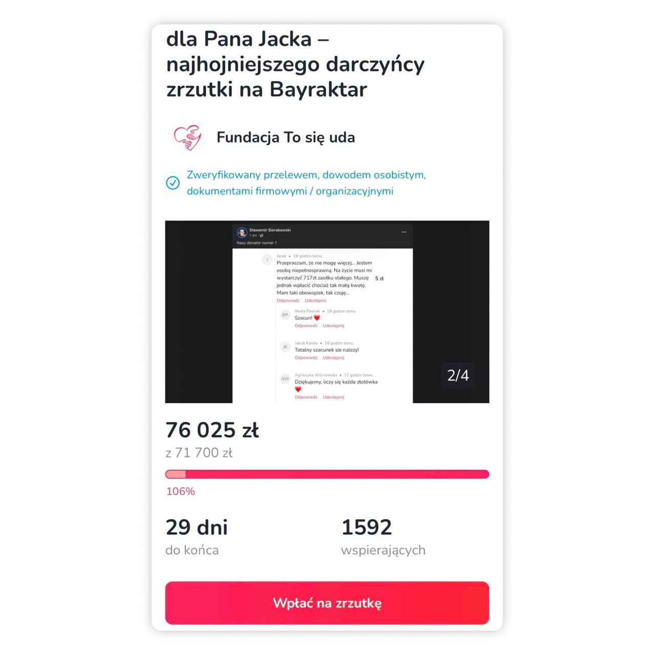 «Пан Яцек, в качестве благодарности за вашу помощь в нашем сборе мы хотели что-то сделать для вас. …Все мы здесь держимся вместе, так что позавчера мы собрали для вас 100 раз по 717 (это было собрано за первых два дня). На ваше здоровье. Миссия выполнена», — написал у себя в фейсбук организатор сбора.