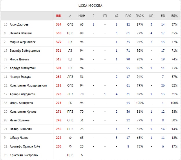Алан Дзагоев - ( 364 ) - свою порцию похвалы, второй матч кряду, заслуживает и центральный полузащитник ЦСКА. Дзага вернулся в футбол и пока не получил очередную травму, выдаёт шикарный отрезок становясь одним из лучших в двух матчах подряд, а вчера ещё и победный. Цифры: гол, 82 паса ( у Влашича и Мары по 61), 3 ключевые передачи, 1 созданный голевой момент, 3 отбора и две обводки.