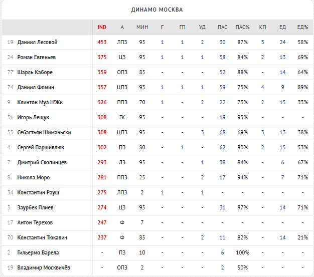 Даниил Лесовой ( 454 ) - АПЗ "Динамо" второй тур подряд становится лучшим игроком по индексу Instat. Даня опять разорвал соперников : гол+пас, 3 передачи под удар, 3 созданных голевых момента, 10 удачных обводок и 14 выигр. ед. Лесовой становится лидером в команде Шварца👀👍🏻