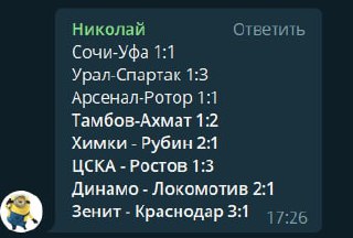 Тур принёс несколько неожиданных результатов, на которых посыпалось большинство участников: осечка "Сочи", потеря очков "Спартаком" и поражение "Рубина", но оказалось, что есть юзер, который сумел угадать 3 точных счёта - его зовут Николай.🔝