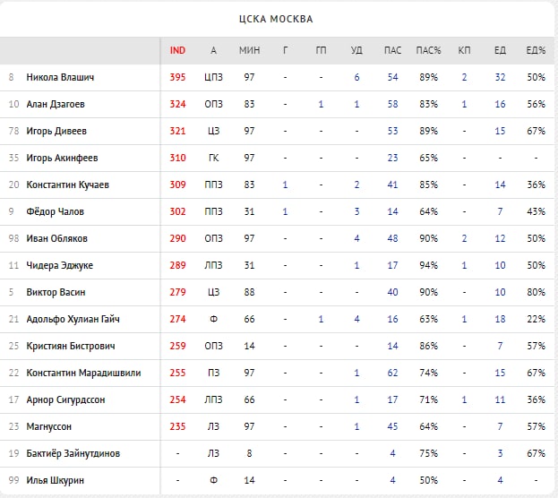 Игорь Дивеев (321) - защитник ЦСКА заслуженно входит в тройку лучших игроков команды, а в игре против "Ростова" на счету Игоря 67% выигранных единоборств, 9 перехватов и 13 подборов, а общее количество удачных ТТД - 80, например у Васина - 52...