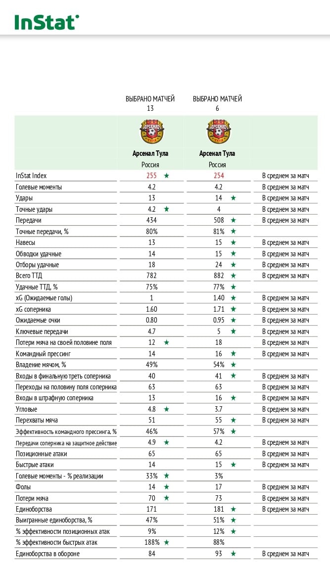 Если многое улучшилось, то почему команда набрал 2 очка из 18 возможных? На самом деле, Дмитрию Парфёнову можно было приходить на пресс-конференцию и в духе Микеля Артеты жаловаться на невезение - вдумайтесь, реализация голевых моментов - 3%..ТРИ ПРОЦЕНТА😱 Если что, то у Подпалого было 33% - одна из лучших в лиге. Заметно упали цифры и по эффективности быстрых атак, если Вы не знали, "Арсенал" с предыдущим тренером был лучшей командой в лиге по контр-атакам, а сейчас гораздо скромнее.
