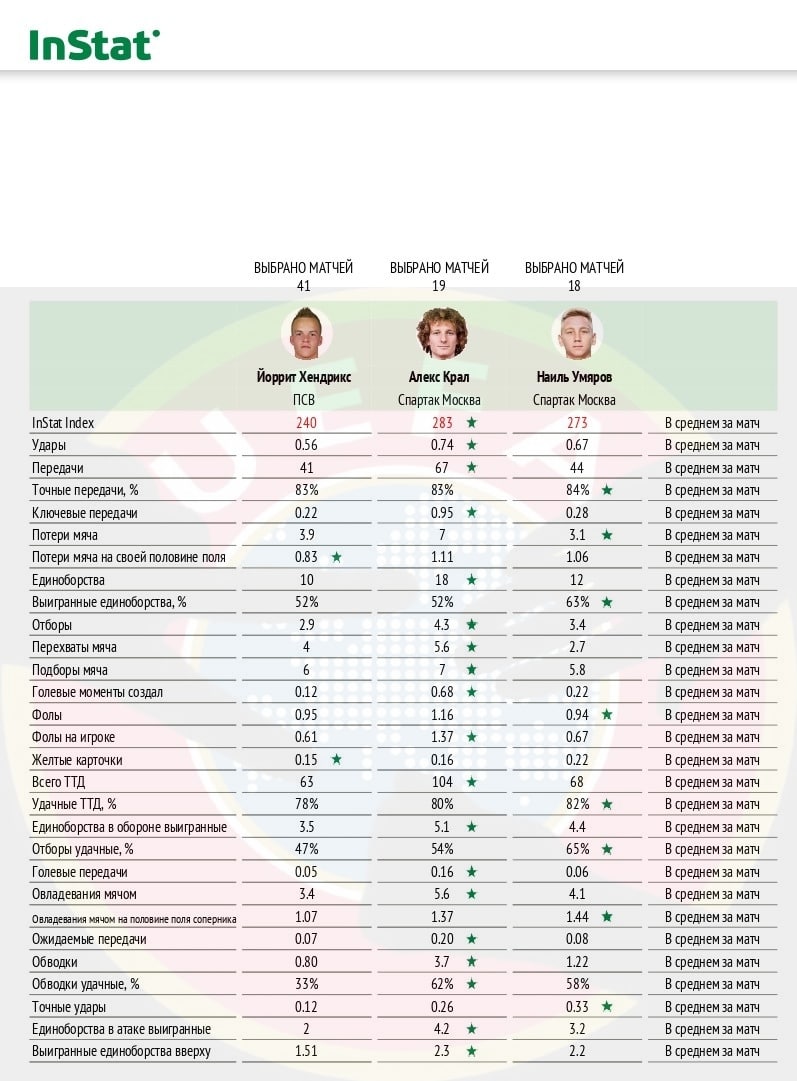 Сравнил индивидуальные показатели будущего игрока "Спартака" с его партнёрами по полузащите - Кралом и Умяровым, причём в случае с голландцем, взял два сезона, чтобы его сторонники не сказали, что НЕ честно, да и цифры в этом сезоне смешные😄