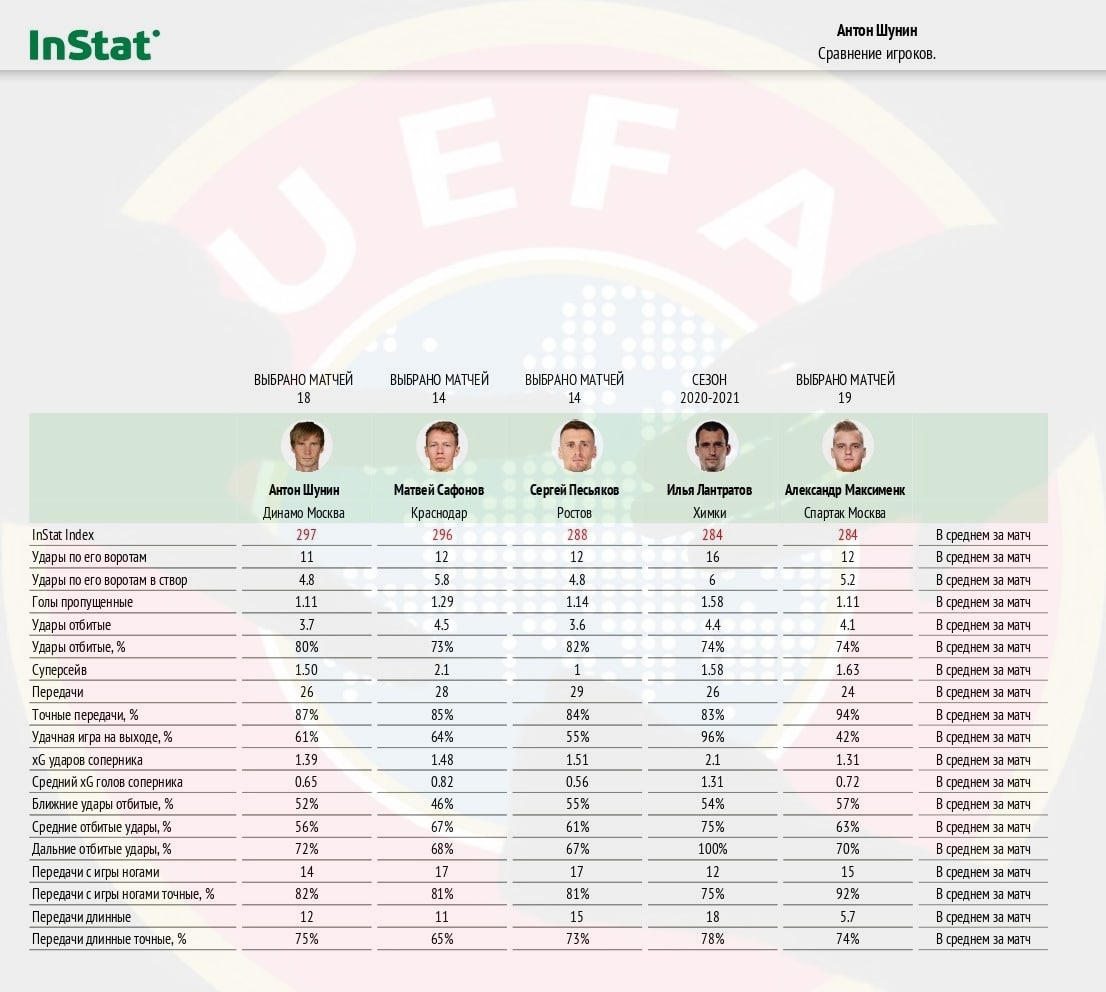 1️⃣ Антон Шунин (Динамо) - 297 баллов по индексу Instat. Вратарь "бело-голубых" проводит потрясающий сезон, став основным вратарём в сборной России. На счету Антона 7 сухих матчей в чемпионате.