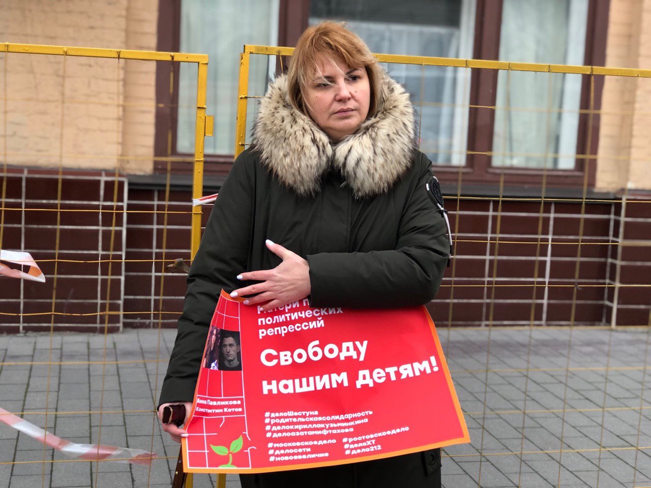 На фото мать Анны Павликовой, фигурантки дела «Нового величия», Юлия, у здания Администрации президента с плакатом с изображениями своей дочери и ее мужа — арестанта «дела 212» Константина Котова.