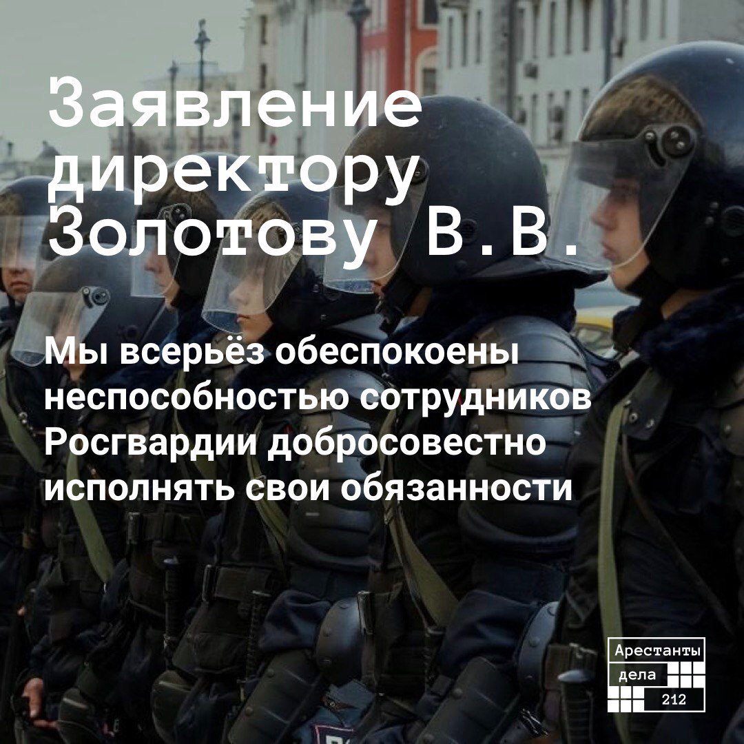 Если вас тоже волнует текущее положение дел в российских органах правопорядка, подпишите заявление директору Росгврадии Золотову по ссылке. Вы можете разместить текст заявления в социальных сетях или передать нам распечатанное и подписанное заявление во время ближайшего суда. Бумажные заявления мы в последствии направим их адресату.
