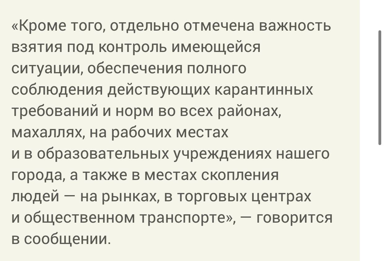 «Хокимият Ташкента сообщил, что соблюдение требований карантина в столице будет взято под строгий контроль».