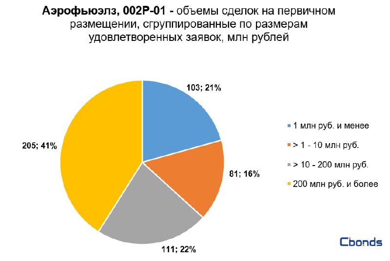 Наибольшую долю в структуре размещения (41%) заняла сделка объёмом 205 млн рублей, на втором месте идут сделки объёмом от 10 до 200 млн рублей (22%).