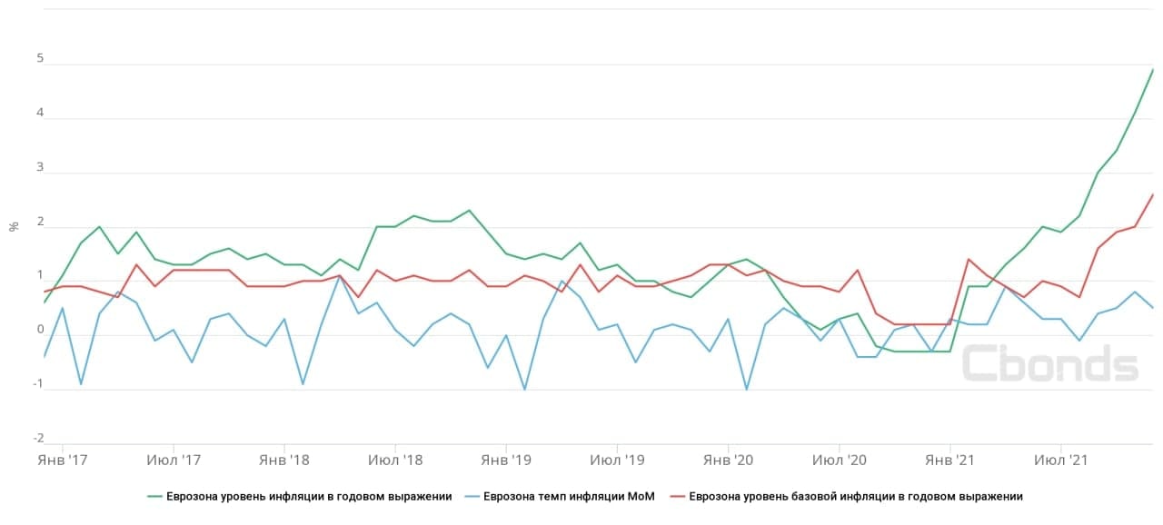 Годовая инфляция в 19 странах еврозоны в ноябре ускорилась до 4,9% с 4,1% по итогам октября. Такое ускорение инфляции стало рекордным с июля 1991 года.