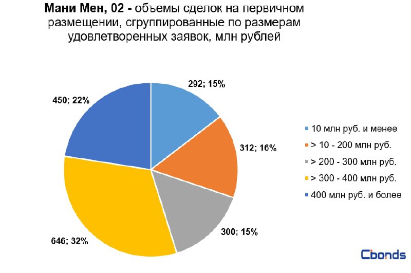 Наибольшую долю в структуре размещения (32%) заняли сделки объёмом от 300 до 400 млн рублей, на втором месте идёт сделка объёмом 450 млн рублей (22%).