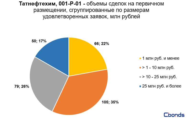 Наибольшую долю в структуре размещения (35%) заняли сделки объёмом от 1 до 10 млн рублей, на втором месте идут сделки объёмом от 10 до 25 млн рублей (26%).