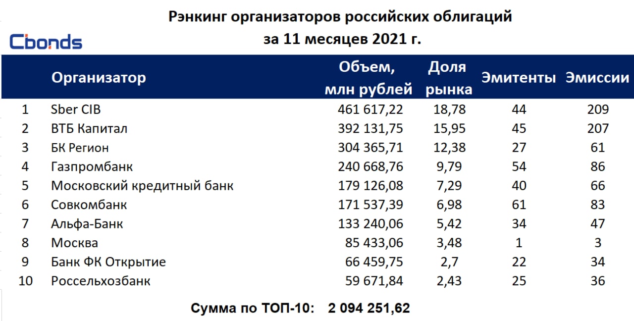 💡🇷🇺 Рэнкинг организаторов российских облигаций по итогам 11 месяцев 2021 года