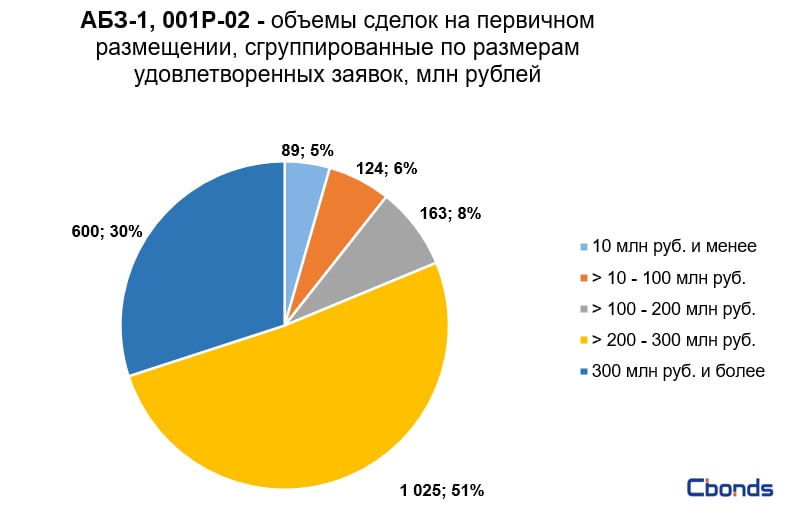 Наибольшую долю в структуре размещения (51%) заняли сделки объёмом от 200 до 300 млн рублей, на втором месте идёт сделка объёмом 600 млн рублей (30%).