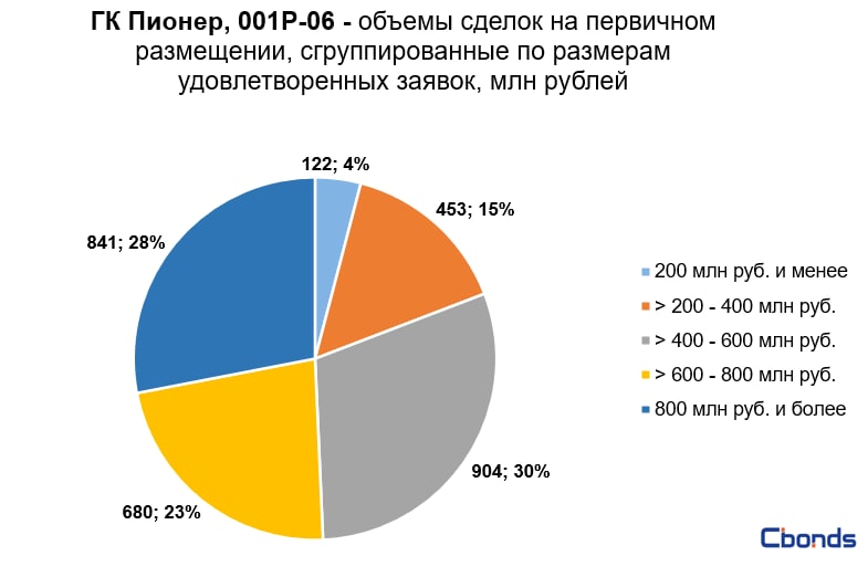 Наибольшую долю в структуре размещения (30%) заняли сделки объёмом от 400 до 600 млн рублей, на втором месте идёт сделка объёмом 841 млн рублей (28%).